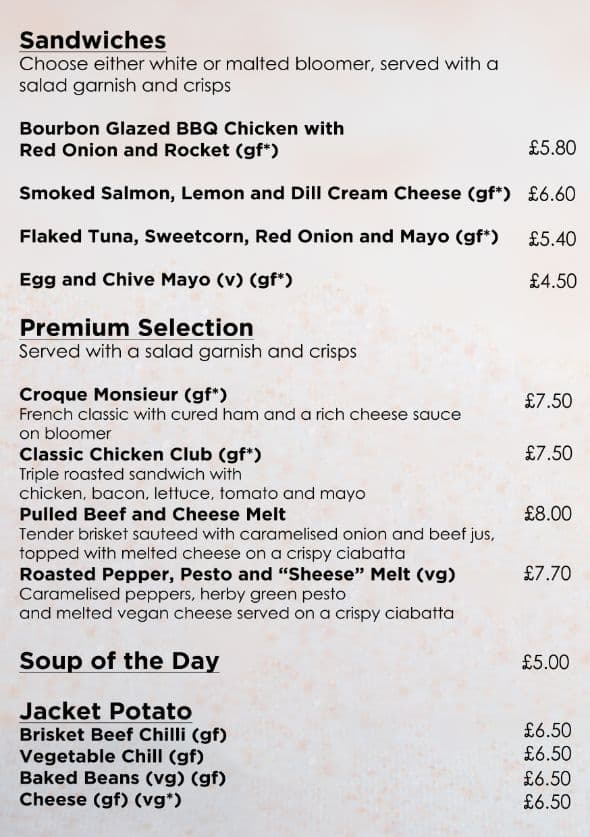 The Café at G Live offers an all-day menu of artisan sandwiches, loaded jacket potatoes, soup of the day, and a premium selection that includes Croque Monsieur, a triple roasted Classic Chicken Club, and vegan Roasted Pepper, Pesto and ‘Sheese’ Melt.